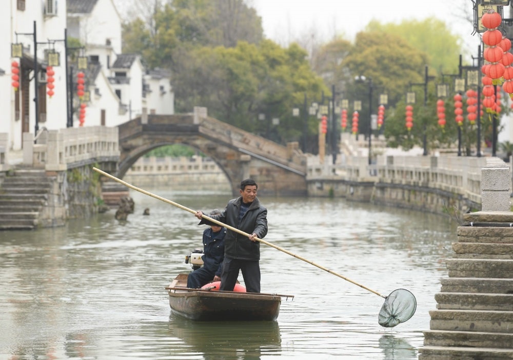 2023年3月16日,在太湖畔的浙江省湖州市織里鎮(zhèn)義皋村,保潔員在清理河道。多年來(lái)的溇港整治使得太湖周邊河道水質(zhì)明顯改善,也為鄉(xiāng)村旅游注入動(dòng)力。新華社記者 翁忻旸 攝