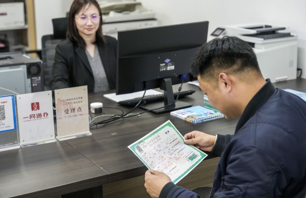 2024年3月8日,市民在位于上海市檔案館的長(zhǎng)三角地區(qū)民生檔案異地查檔受理點(diǎn)查詢(xún)出生醫(yī)學(xué)證明檔案。新華社發(fā)(陳夢(mèng)澤 攝)
