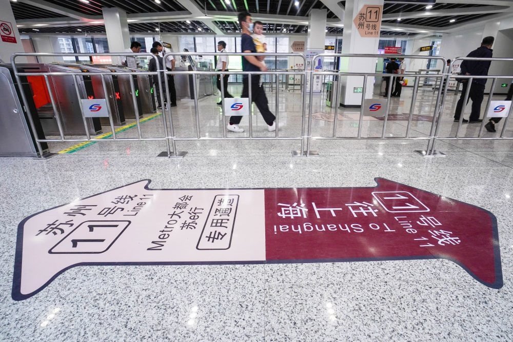 2023年6月24日,乘客在蘇州軌道交通11號(hào)線花橋站進(jìn)站乘車(chē)。當(dāng)日,蘇州軌道交通11號(hào)線正式投入運(yùn)營(yíng),并與上海軌道交通11號(hào)線實(shí)現(xiàn)無(wú)縫換乘,長(zhǎng)三角核心城市間首次實(shí)現(xiàn)地鐵系統(tǒng)跨省互聯(lián)互通。新華社記者 李博 攝