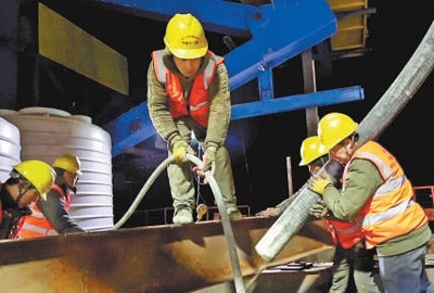 寒風(fēng)勁吹,杭州灣跨海鐵路大橋建設(shè)現(xiàn)場依舊熱火朝天,千余名建設(shè)者正在緊張地進行大橋橋墩墩身施工作業(yè)。