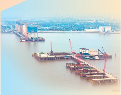 杭州灣跨海鐵路大橋1—12號橋墩施工現(xiàn)場。