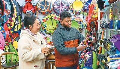 浙江義烏國(guó)際商貿(mào)城一家戶外滑雪用具店鋪內(nèi),外商在洽談、選購戶外冰雪運(yùn)動(dòng)裝備。