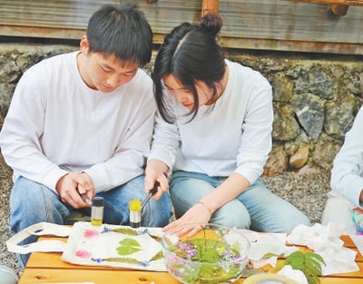 圖為顧客在肖婷婷的民宿體驗“拓印春天”手工活動。