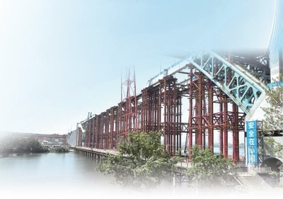 一條沱江,清水悠悠。橋面,錘聲連連,焊花四落;橋下,鋼柱林立,江水緩流。站在岸邊高坡遠望,一座巨“弓”初具雛形,安臥在橋墩之上。
