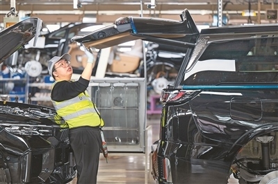 在位于湖北武漢經(jīng)開(kāi)區(qū)的嵐圖汽車(chē)數(shù)字化總裝車(chē)間,工人在流水線(xiàn)上作業(yè)。