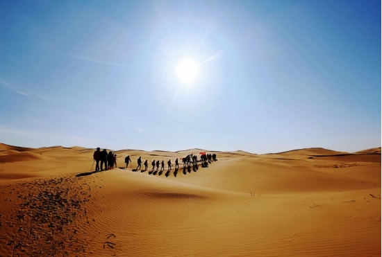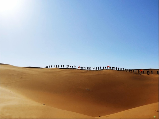 4月8日,內(nèi)蒙古鄂爾多斯杭錦旗境內(nèi)的庫(kù)布其沙漠,一隊(duì)游客正在沙漠中穿沙。