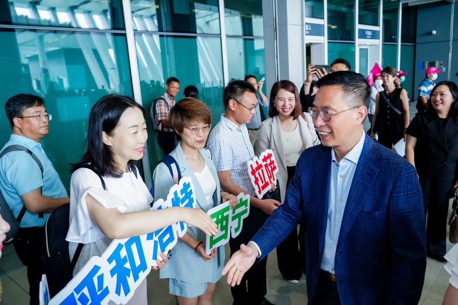6月2日一早,在蓮塘口岸,考察團(tuán)受到香港特區(qū)政府文化體育及旅游局局長(zhǎng)楊潤(rùn)雄的熱烈歡迎。