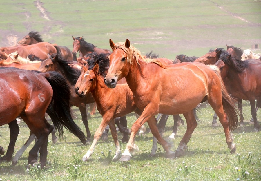 活動(dòng)現(xiàn)場(chǎng)尤為引人注目的還有“萬馬奔騰”表演,只見騎手們頭纏彩巾,揚(yáng)鞭策馬,他們身旁,近萬匹馬兒在騎手的驅(qū)趕下奔馳而來,馬蹄聲下草原上揚(yáng)起陣陣沙塵,十分壯觀。