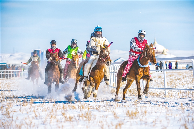 1月18日,錫林浩特市那達(dá)慕風(fēng)情園內(nèi)馬蹄踏雪、人聲鼎沸,“歌游內(nèi)蒙古·暢享錫林浩特”——冬季那達(dá)慕暨蒙古馬超級(jí)聯(lián)賽在歡騰的歌聲中拉開序幕。開幕式上,隨著馬蹄的噠噠聲,一支雄壯的馬隊(duì)踏雪而來,騎手們身著艷麗的蒙古袍,駕馭著矯健的蒙古馬,以整齊的隊(duì)列自遠(yuǎn)處緩緩走來。歌聲悠揚(yáng),舞姿豪邁,演員們以動(dòng)人的演繹,完美詮釋了力量與藝術(shù)之美。本次賽事包含15公里耐力賽、10公里3人團(tuán)體接力賽、跑馬射箭、跑馬拾哈達(dá)、6公里走馬及搏克比賽等比賽項(xiàng)目。賽場(chǎng)上,騎手們馭馬飛馳,人與馬默契配合,在銀裝素裹的雪原上縱橫馳騁。在跑馬射箭與跑馬拾哈達(dá)項(xiàng)目上,騎手在飛奔的馬匹上挽弓搭箭、俯身拾物,動(dòng)作行云流水,精湛技藝引來觀眾陣陣驚呼與贊嘆。除了扣人心弦的比賽,本次活動(dòng)還為游客打造了豐富的冰雪互動(dòng)體驗(yàn)。冰雪涮肉宴香氣四溢,草原篝火電音派對(duì)將熱情推向高潮,千人雪戰(zhàn)、雪地拔河等趣味項(xiàng)目讓游客親身參與,盡情享受冰雪樂趣。現(xiàn)場(chǎng)還同步舉辦了錫林浩特“伊德喜”草原冬儲(chǔ)肉展銷活動(dòng),讓游客在觀賽之余,還能選購(gòu)到正宗錫林郭勒牛羊肉,體驗(yàn)純正的草原風(fēng)味。(記者