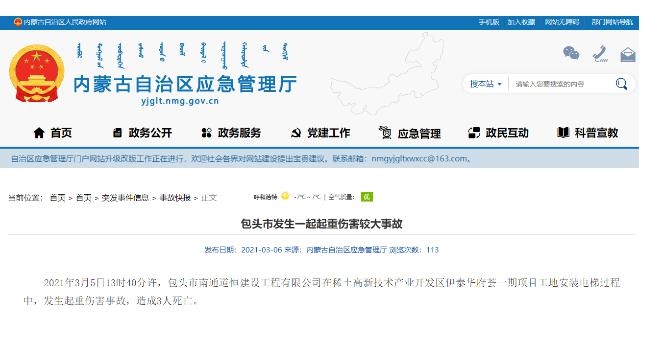 北疆新聞網(wǎng)、北疆新聞客戶端消息(記者 李艷紅)記者從內(nèi)蒙古自治區(qū)應(yīng)急管理廳獲悉,3月5日13時(shí)40分許,包頭市南通道恒建設(shè)工程有限公司在稀土高新技術(shù)產(chǎn)業(yè)開(kāi)發(fā)區(qū)伊泰華府薈一期項(xiàng)目工地安裝電梯過(guò)程中,發(fā)生一起重傷害事故,造成3人死亡。據(jù)了解,死亡原因可能為員工操作不當(dāng)造成。