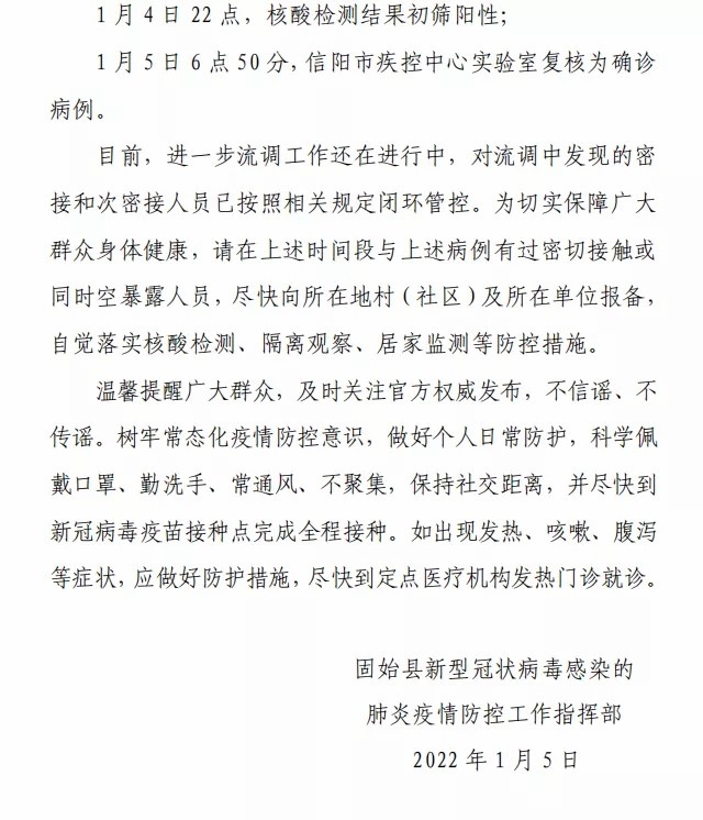 據(jù)固始縣委宣傳部微信公眾號消息,1月4日,河南固始縣在核酸檢測中發(fā)現(xiàn)初篩陽性病例1例,經(jīng)信陽市疾控中心實驗室復(fù)核為確診病例。