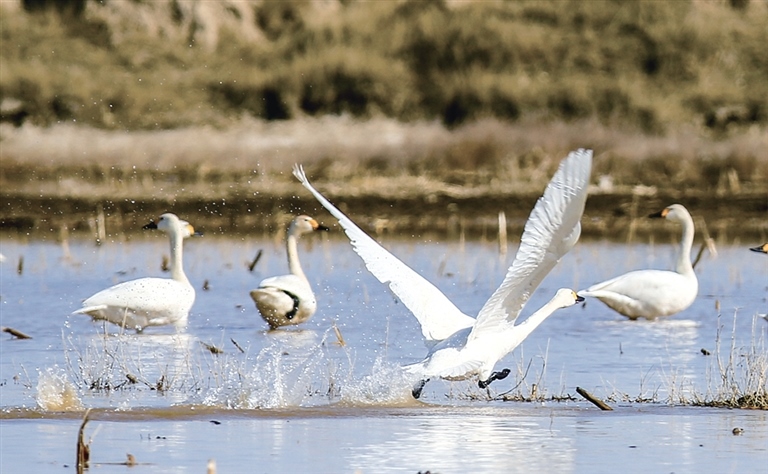 托克托縣黃河濕地管護中心副主任王曉東接受記者采訪時表示,黃河流經(jīng)托克托縣37.5公里、9個自然村。隨著近年來對黃河流域生態(tài)環(huán)境保護力度的加大,每年都會吸引大批鳥類來托克托縣“做客”,其中尤以天鵝最受關(guān)注。天鵝屬于國家二級保護鳥類,每年從2月底3月初開始,就會成群結(jié)隊來黃河流域一帶停歇、棲息、覓食,補充能量后,再繼續(xù)飛行,最多的時候有上萬只。(記者 張巧珍 牛天甲)