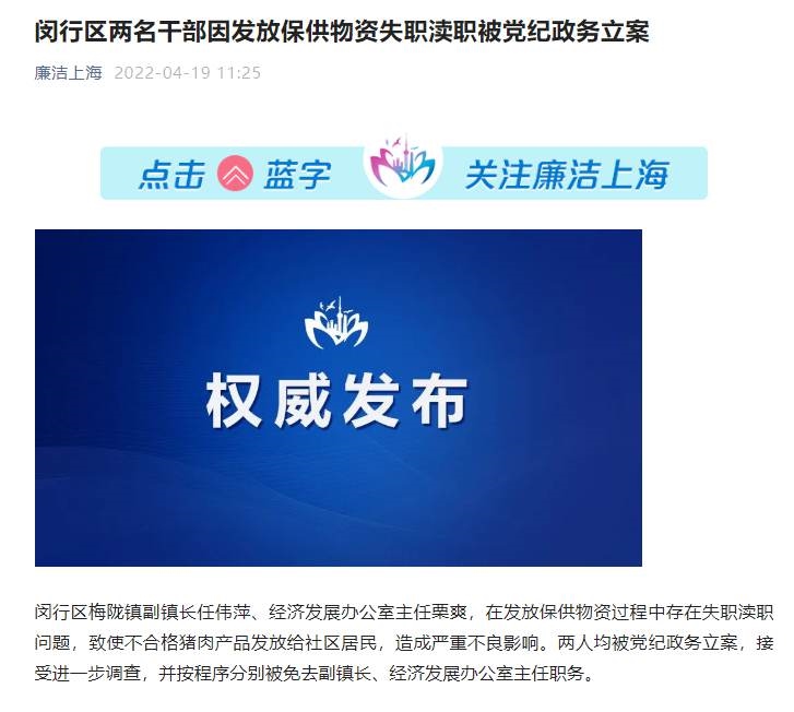 閔行區(qū)梅隴鎮(zhèn)副鎮(zhèn)長任偉萍、經(jīng)濟發(fā)展辦公室主任栗爽,在發(fā)放保供物資過程中存在失職瀆職問題,致使不合格豬肉產(chǎn)品發(fā)放給社區(qū)居民,造成嚴(yán)重不良影響。兩人均被黨紀(jì)政務(wù)立案,接受進一步調(diào)查,并按程序分別被免去副鎮(zhèn)長、經(jīng)濟發(fā)展辦公室主任職務(wù)。