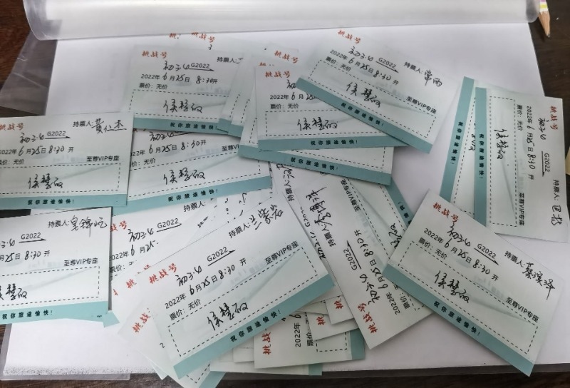 6月20日,呼和浩特市第五中學(xué)初三(4)班班主任侯慧敏老師給班里57名學(xué)生的手寫“告別信”刷屏朋友圈,紙短情長,愛意滿滿。每封信箋做成車票的樣式,正面寫著車次:“挑戰(zhàn)號”G2022;時間:2022年6月25日8時30分;座位:至尊VIP專座;票價:無價?!敖K點(diǎn)站”并未填寫。侯慧敏說,那是孩子們的夢想,需要靠他們自己來完成。當(dāng)天的畢業(yè)班會上,當(dāng)每個學(xué)生打開信箋,滿滿的回憶和濃濃的情誼不禁讓孩子們潸然淚下。
