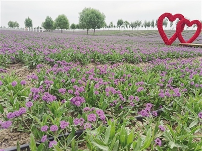 8月23日,記者來到馬鞭草花海,遠(yuǎn)遠(yuǎn)望去,遍野的紫色在視線中彌漫開來,叫人情不自禁奔向花海。微風(fēng)拂過,花枝搖曳,心形造型、大風(fēng)車、馬頭琴等景觀小品點(diǎn)綴其間,給花海增添了一份浪漫情調(diào)。人們沿著