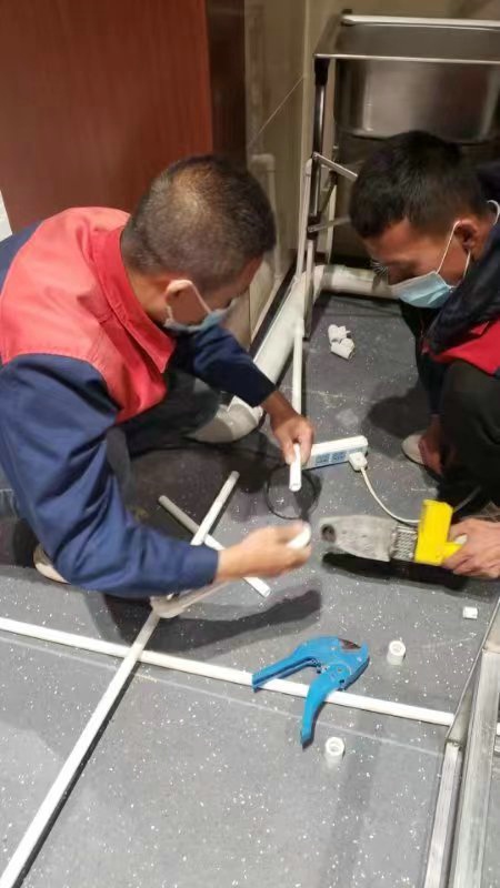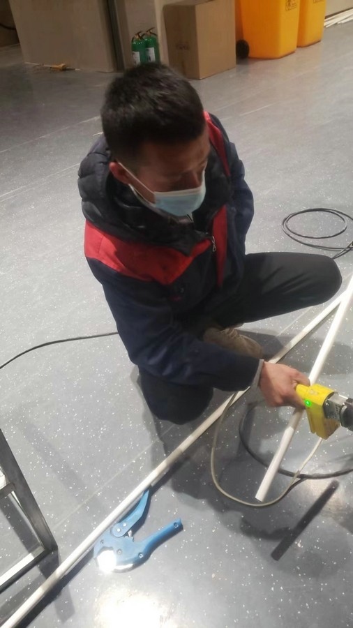 深夜,氣溫突降,冷風毫不留情地灌入現(xiàn)場施工人員的衣服里,但無一人松勁、無一人退縮。由于材料分布范圍較大,只見身穿紅、藍工作服的他們徒步穿梭于各樓層之間,一刻不停地搬運管件及材料、安裝設備。因疫情管控不能到現(xiàn)場的同事則堅持利用通訊工具提供遠程技術(shù)支持,為前線答疑解惑。方艙醫(yī)院建設屬于應急工程,時間緊、任務重,加之現(xiàn)場材料缺乏,施工人員只能就地取材,爭分奪秒的同時,“突擊隊”表現(xiàn)出了高度的專業(yè)性,迅速、細致、高效地進行管道鋪設和熱水器安裝……凌晨4點,在現(xiàn)場全體施工人員的共同努力下,方艙醫(yī)院水暖安裝工作順利完成。