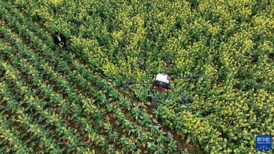 2月17日,在貴州省六盤水市六枝特區(qū)木崗鎮(zhèn)油菜基地,農(nóng)技人員利用植保無人機進行春管。