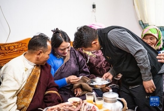在位于森布日安置點(diǎn)的家中,石秀次仁(左)和家人一起吃“古突”(2月19日攝)。