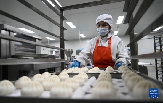 天津利達(dá)糧油有限公司速凍面食生產(chǎn)車間,工作人員在搬運(yùn)速凍包子(2月23日攝)。