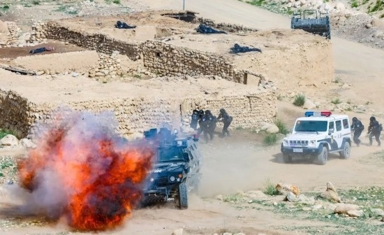 新疆邊檢總站喀什邊境管理支隊(duì)開展實(shí)戰(zhàn)模擬演練。圖為該支隊(duì)移民管理警察步甲協(xié)同,圍捕藏匿在房屋內(nèi)的不法分子。
