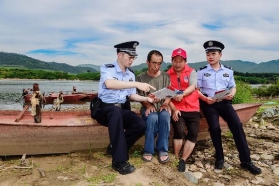 圖為移民管理警察王鐵映開(kāi)展?jié)O船民管理宣傳工作。