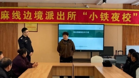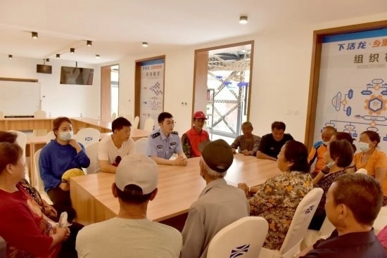 圖為移民管理警察王鐵映組織轄區(qū)群眾開(kāi)展群防群治工作會(huì)議。