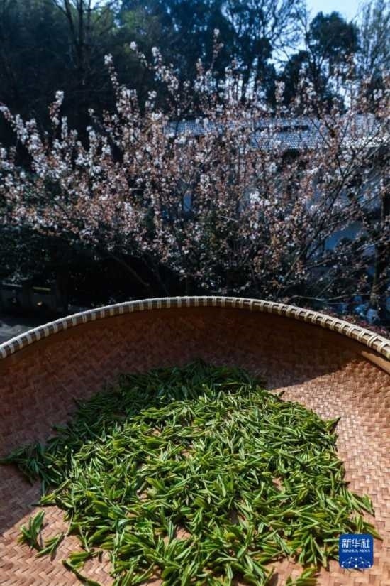 3月13日拍攝的龍井村茶農(nóng)剛剛采摘的西湖龍井“明前茶”鮮葉。