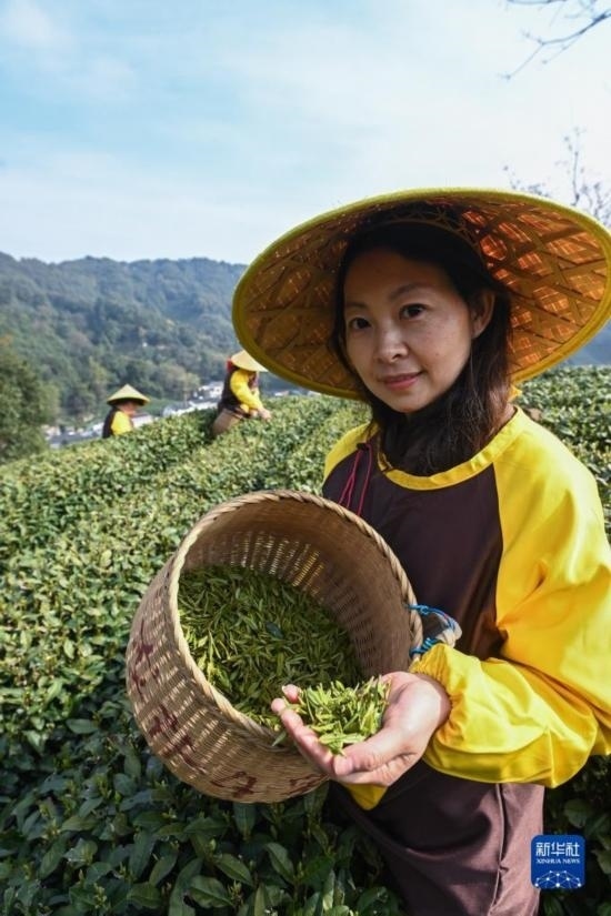 3月13日,龍井村的茶農(nóng)徐雅軍在展示剛剛采摘的西湖龍井鮮葉。