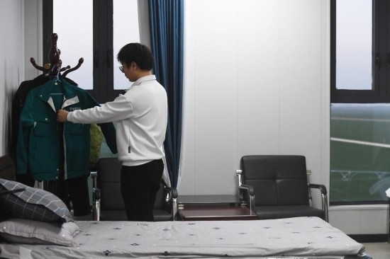 3月14日,在西平縣老王坡高標(biāo)準(zhǔn)服務(wù)中心的宿舍內(nèi),臺(tái)曉林下班后換下工作服、整理衣架。