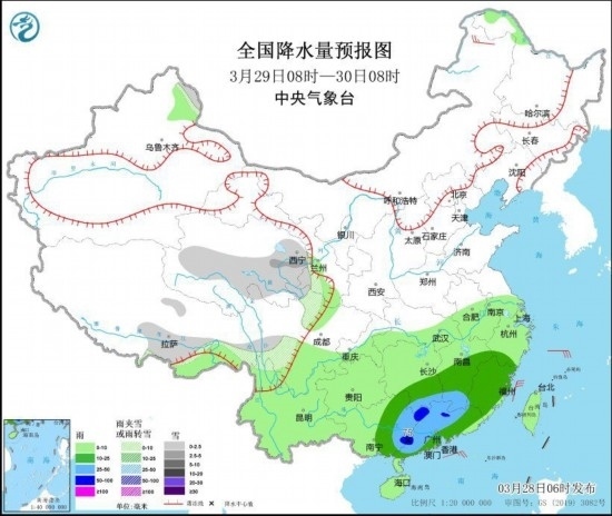 圖2 全國(guó)降水量預(yù)報(bào)圖(3月29日08時(shí)-30日08時(shí))
