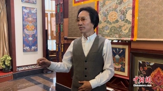 非遺傳承人拉孟長期致力于免費培養(yǎng)唐卡傳承人。圖為拉孟介紹唐卡文化。中新網記者 劉湃 攝