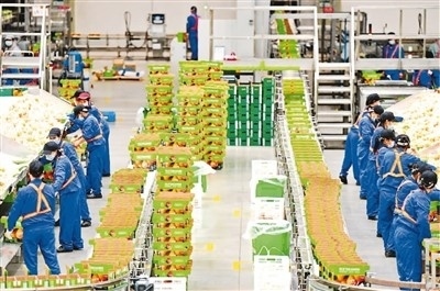 2022年11月27日,江西省贛州市信豐縣高新技術(shù)產(chǎn)業(yè)園區(qū)的一家臍橙加工企業(yè),工人在智能分選包裝生產(chǎn)線上篩選裝運臍橙鮮果。 朱海鵬攝(人民視覺)