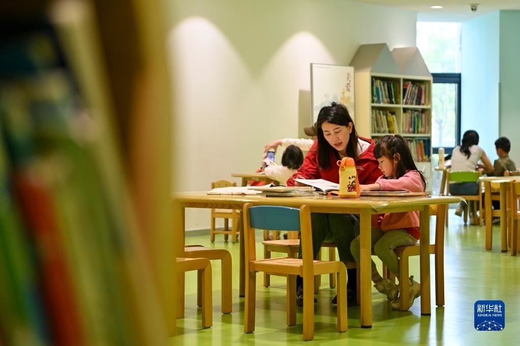 5月2日,一名家長帶著小朋友在江蘇省泰興市新時(shí)代文明實(shí)踐中心城市書房閱讀。