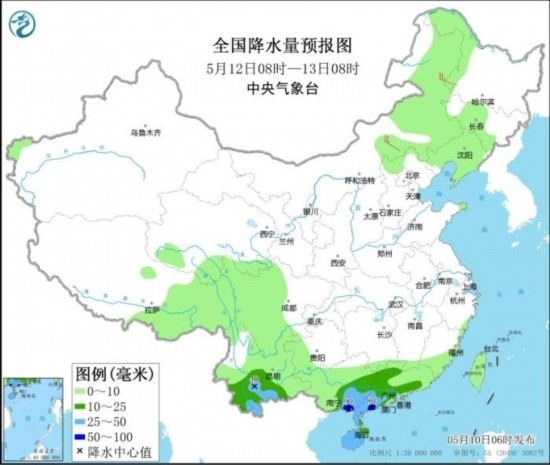 全國(guó)降水量預(yù)報(bào)圖(5月10日08時(shí)-11日08時(shí))