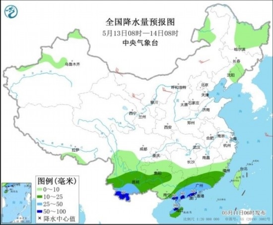 全國(guó)降水量預(yù)報(bào)圖(5月13日08時(shí)-14日08時(shí))