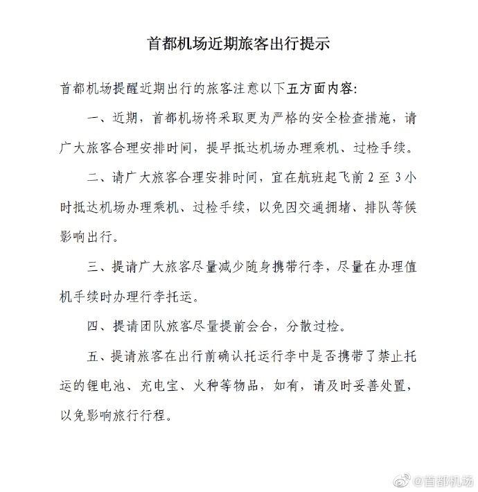 央視網消息:5月16日,@首都機場 官方微博發(fā)布提示:首都機場近期將采取更為嚴格的安全檢查措施,請廣大旅客合理安排時間,提早抵達機場辦理乘機、過檢手續(xù)。