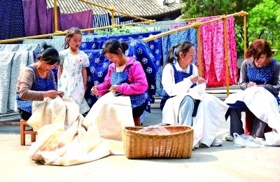 云南巍山縣,幾位民族工藝廠女員工在進行非遺扎染產(chǎn)品制作。張樹祿攝/光明圖片