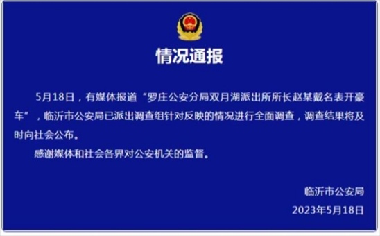 ·網(wǎng)傳山東省臨沂市羅莊區(qū)雙月湖派出所所長(zhǎng)趙某戴名表、開豪車一事引發(fā)關(guān)注,臨沂市公安局發(fā)布情況通報(bào)。