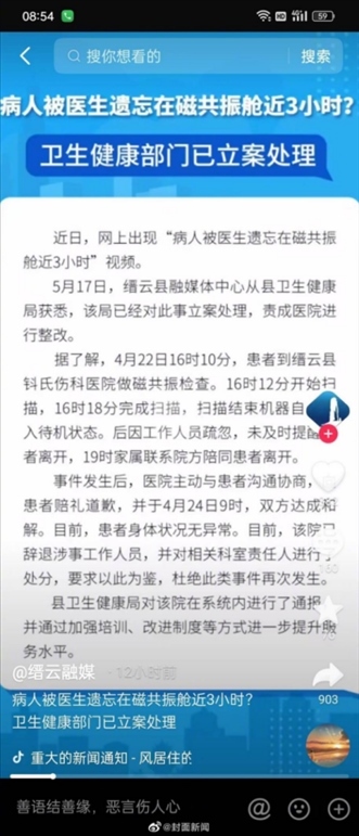 ·官方通報(bào)“病人被遺留磁共振艙3小時(shí)事件”:雙方已和解,涉事人員被辭退。