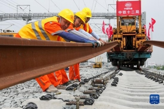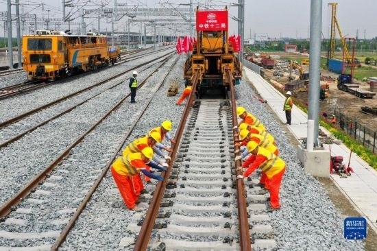5月20日,在滬寧沿江高鐵太倉站施工現(xiàn)場,中鐵十二局的工程人員利用機(jī)械將鋼軌放入承軌槽。