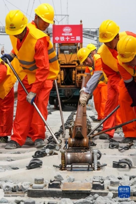 5月20日,在滬寧沿江高鐵太倉站施工現(xiàn)場,中鐵十二局的工程人員準(zhǔn)備進(jìn)行螺栓緊固作業(yè),將對接好的鋼軌固定。