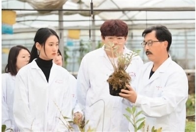 萊蕪職業(yè)技術(shù)學(xué)院師生在萊蕪區(qū)苗山鎮(zhèn)田家樓村的白花丹參種植基地查看種苗情況。趙樹宴攝
