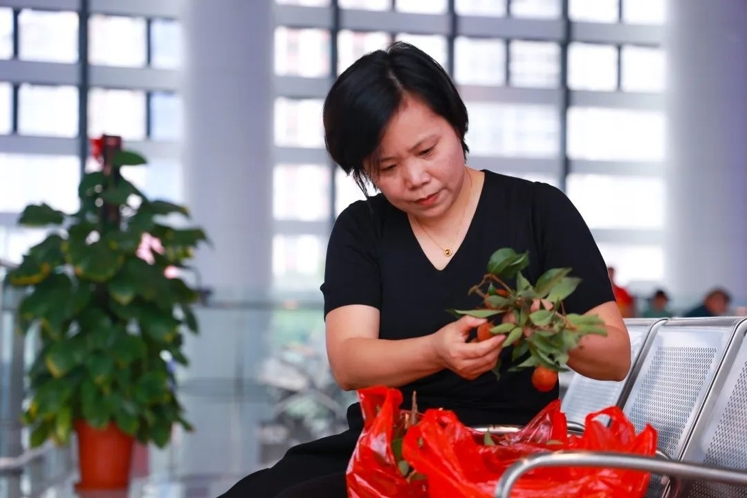 寬敞明亮的候車室內(nèi),旅客蘭海英正利用候車時(shí)間打理剛買到的荔枝。她是從廣州到茂名出差,看到有新鮮荔枝上市,馬上買了12斤白糖罌。