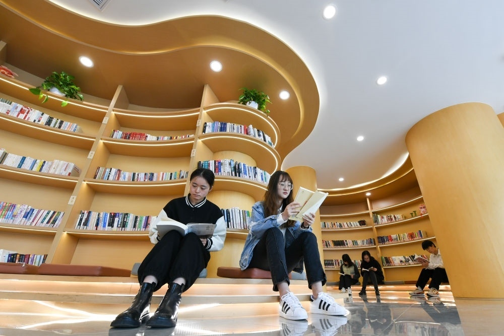 市民在江蘇省張家港市沙洲湖益空間·源書房內閱讀(2023年4月21日攝)。新華社記者 李博 攝