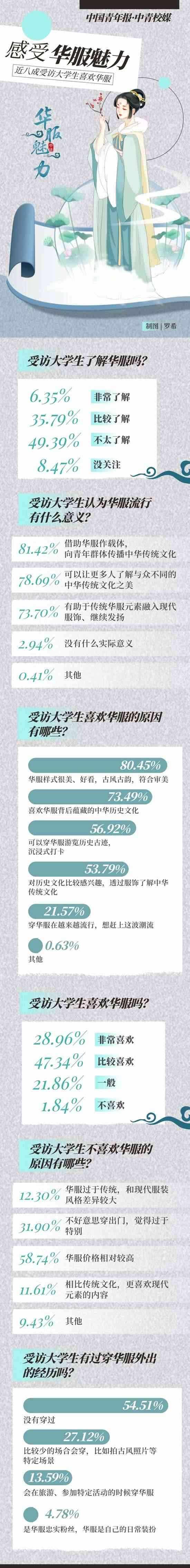 穿華服正在成為一些年輕人旅游或日常出行的選擇?!叭A服”,是指具有中華民族歷史文化基因、精神風(fēng)貌,且融合當(dāng)代審美的禮儀性服裝,其服裝風(fēng)格根植于中華傳統(tǒng)文化,傳承中華民族特質(zhì),體現(xiàn)當(dāng)代社會(huì)積極向上的時(shí)代精神,具有鮮明的辨識(shí)度,適用于國際交往、文化交流、商貿(mào)往來以及日常節(jié)慶、典祭等禮儀場合。自2018年起,每年的農(nóng)歷三月初三被選定為“中國華服日”,在前不久結(jié)束的第五屆“中國華服日”活動(dòng)中,上萬名青年華服愛好者匯聚活動(dòng)現(xiàn)場參與體驗(yàn)。近日,中國青年報(bào)社·中青校媒面向全國高校大學(xué)生發(fā)起問卷調(diào)查,共回收117所高校學(xué)生填寫的有效問卷1464份。調(diào)查結(jié)果顯示,76.30%受訪者表示喜歡華服,42.14%受訪者表示對(duì)華服有一定的了解。