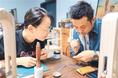 作為今年上海市為民辦實事項目“社會大美育課堂”的重要組成部分,今年上海市民藝術(shù)夜校春季班共開設(shè)教學點位123個、課程278門、招收學員6507人。夜校學習內(nèi)容包括傳統(tǒng)文化、時尚文化、非遺技藝、江南文化以及區(qū)域文化等。圖為5月8日,上海市寶山區(qū)淞南鎮(zhèn)社區(qū)文化活動中心,老師(右)正在指導學生皮具制作技巧。王 初攝(人民圖片)