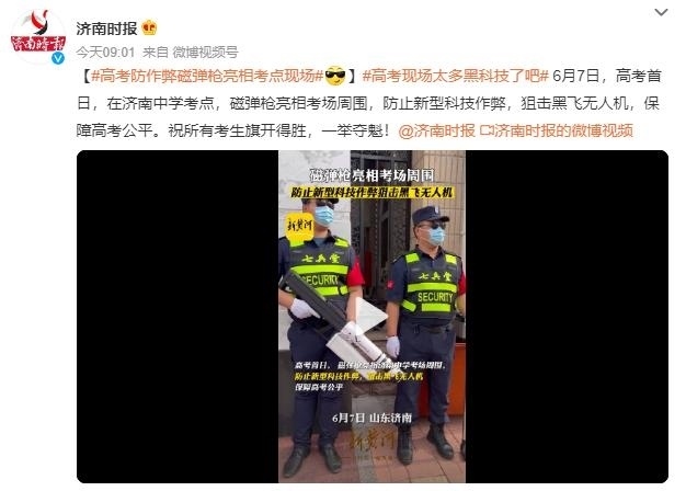 ·高考防作弊磁彈槍亮相山東濟(jì)南考點(diǎn)現(xiàn)場(chǎng):防止新型科技作弊,狙擊黑飛無人機(jī)。