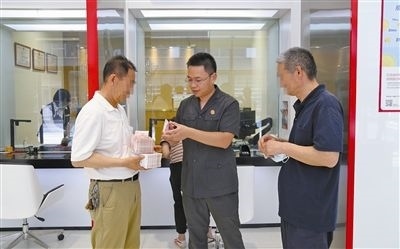 圖④:法官將案款送到當(dāng)事人劉某手中。