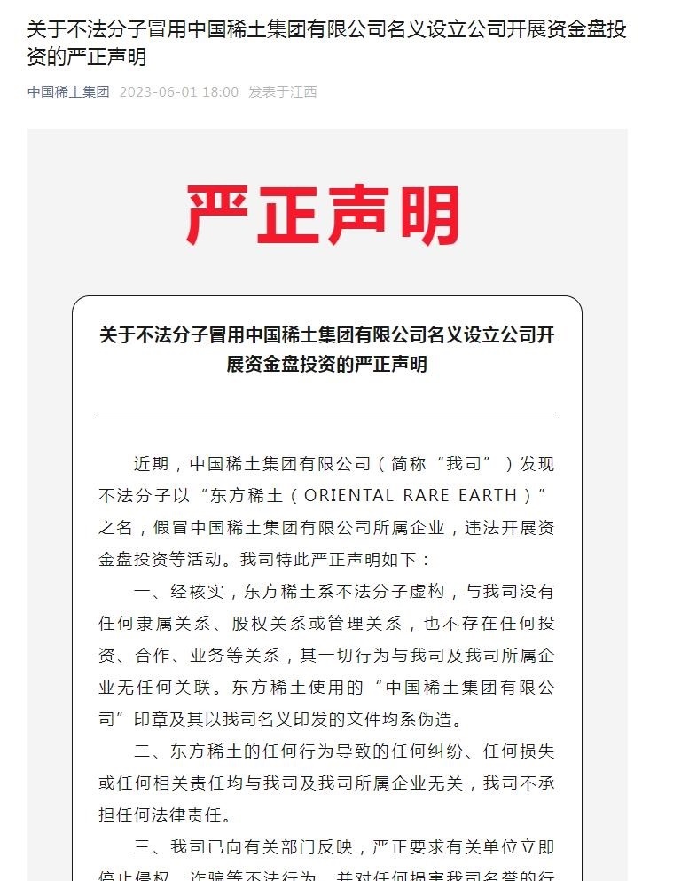 中國(guó)稀土表示,經(jīng)核實(shí),東方稀土系不法分子虛構(gòu),與公司沒(méi)有任何隸屬關(guān)系、股權(quán)關(guān)系或管理關(guān)系,也不存在任何投資、合作、業(yè)務(wù)等關(guān)系,其一切行為與公司及公司所屬企業(yè)無(wú)任何關(guān)聯(lián)。東方稀土使用的“中國(guó)稀土集團(tuán)有限公司”印章及其以我司名義印發(fā)的文件均系偽造。