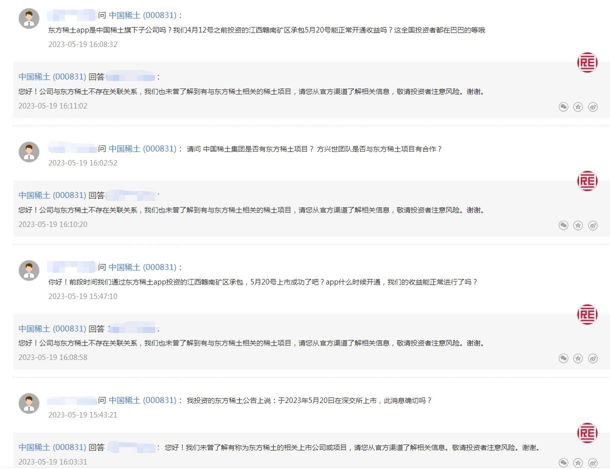 中新財(cái)經(jīng)注意到,有投資者曾在互動(dòng)平臺(tái)上向中國(guó)稀土詢(xún)問(wèn)“東方稀土”相關(guān)信息,從提問(wèn)內(nèi)容看,可能已有投資者被誤導(dǎo)受騙。比如,“東方稀土APP是中國(guó)稀土旗下子公司嗎?我們4月12號(hào)之前投資的江西贛南礦區(qū)承包5月20號(hào)能正常開(kāi)通收益嗎?”“我投資的東方稀土公告上說(shuō):于2023年5月20曰在深交所上市,此消息確切嗎?”等等。